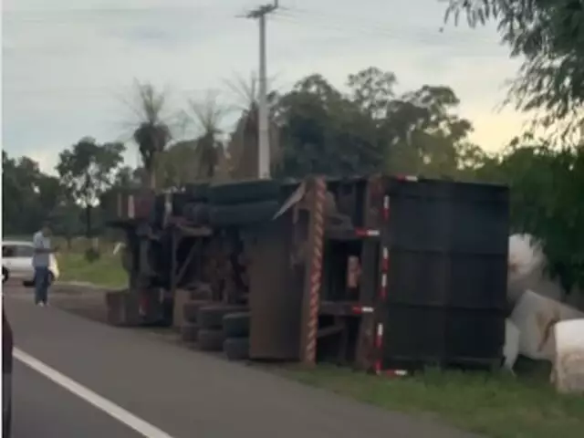 Uma carreta carregada com cerca de 30 toneladas de silagem tombou no fim da tarde de quinta-feira (12), na saída para Cuiabá (MT), em Campo Grande. O acidente ocorreu por volta das 17h50, no km 485 da BR-163, e mobilizou equipes da concessionária Motiva Pantanal, responsável pelo trecho. Segundo o Centro de Controle Operacional da concessionária, o veículo seguia pela rodovia quando o caminhoneiro tentou fazer uma conversão à direita para acessar a Rua Acrópole. Devido ao desnível existente no