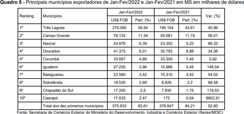 Sobre o principal município exportador, Três Lagoas teve participação de 39,94% nas vendas, devido sobretudo às indústrias de papel e celulose instaladas pela região. Em segundo lugar vem Campo Grande (11,34%), depois Naviraí (6,39%) e Dourados (6,01%). Os dez principais municípios exportadores responderam por 83,61% das exportações sul-mato-grossenses no primeiro bimestre.