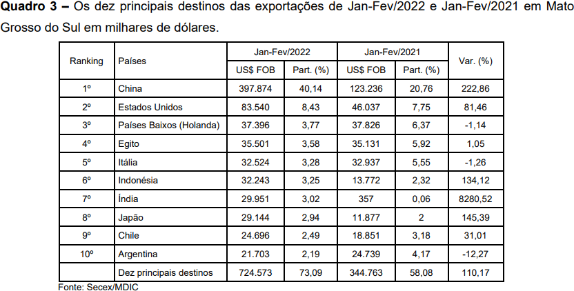 Com relação ao destino das exportações, não houve alteração nas primeiras posições da tabela, porém a China ampliou de forma significativa sua parcela no mercado exterior sul-mato-grossense.