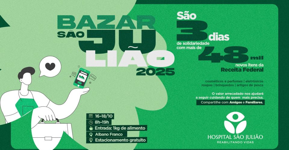 O Hospital São Julião realiza, de 16 a 18 de outubro de 2025, o Bazar do São Julião, no Centro de Convenções Albano Franco, em Campo Grande. Serão mais de 48 mil itens oriundos de doações da Receita Federal, incluindo cosméticos e perfumes, eletrônicos, roupas, brinquedos, artigos de pesca e muito mais. Tudo com preços acessíveis, a partir de R$ 5, em um evento que alia consumo consciente e solidariedade.