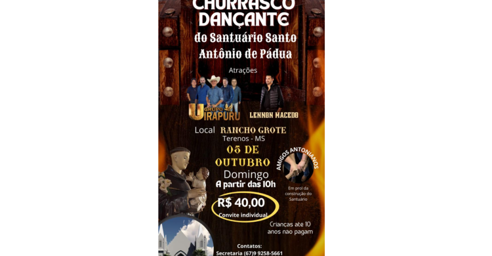 O município de Terenos (MS) será palco de um grande encontro de fé, música e confraternização no dia 05 de outubro (domingo), a partir das 10h, com a realização do Churrasco Dançante do Santuário Santo Antônio de Pádua.
