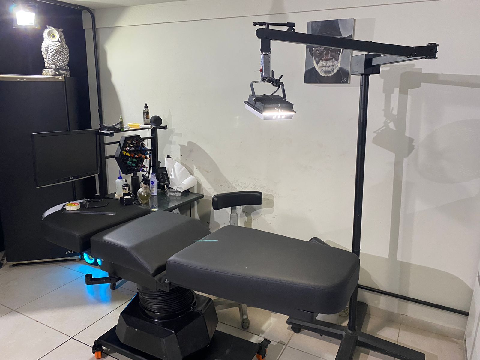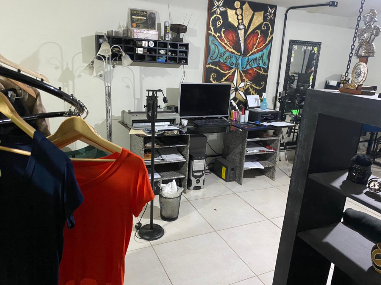 O estúdio fica no 2º andar, em cima de uma barber shop. No espaço onde a mágica é feita na pele, há também uma lojinha com peças selecionadas pela namorada do tatuador.