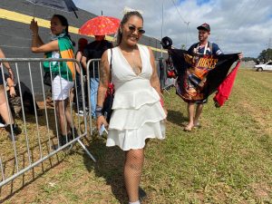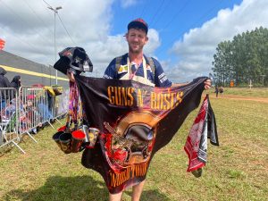 No corredor próximo ao Autódromo Orlando Moura, Caio Santos Pitanga se destacava vendendo produtos oficiais do Guns N’ Roses. Ao seu lado, Leandro Vidal, de São Paulo, acompanhava a banda em toda a turnê, oferecendo itens que variavam de R$30 a R$100, como copos, camisetas e bandanas, chamando atenção pela variedade e pelo preço acessível.A movimentação se intensificou à medida que o público chegava para o show, e Caio revelou que acompanha a banda desde Porto Alegre, seguindo a turnê por diferentes cidades.