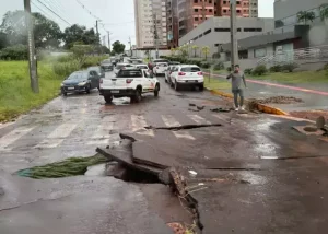 Força da chuva arranca asfalto e provoca novos estragos na Avenida Rachid Neder