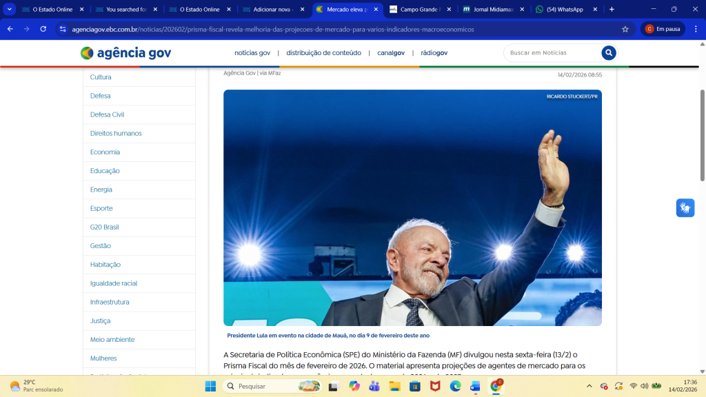 Melhoraram expectativas para PIB nominal e inflação, resultado primário, arrecadação das receitas federais, receita líquida e nominal e também da dívida bruta do Governo Geral. É o que revela o Prisma Fiscal do Ministério da Fazenda A Secretaria de Política Econômica (SPE) do Ministério da Fazenda (MF) divulgou nesta sexta-feira (13/2) o Prisma Fiscal do … Continue lendo Mercado eleva projeções positivas para a economia do Brasil em 2026, revela levantamento
