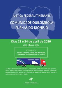 O TRF3 (Tribunal Regional Federal da 3ª Região) e a JFMS (Justiça Federal em Mato Grosso do Sul) realizam, nos dias 23 e 24 de abril, o JEF (Juizado Especial Federal) Itinerante na comunidade quilombola Furnas do Dionísio, em Jaraguari/MS. Os atendimentos ocorrem das 8h às 16h, na Escola Estadual Zumbi dos Palmares.