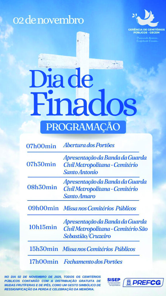 Conforme a programação nos cemitérios, a abertura dos portões está prevista para às 7h. A Banda da Guarda Civil Metropolitana fará apresentações musicais nos três principais cemitérios, Santo Antônio, Santo Amaro e São Sebastião (Cruzeiro), executando canções solenes que convidam à reflexão e ao respeito em memória aos entes queridos.