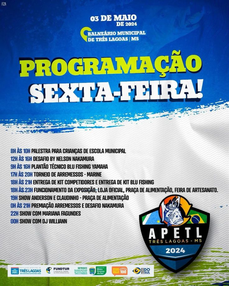 A programação que começa hoje(02) conta com exposição, entrega de kits de blu fishing aos competidores, praça de alimentação e segue na sexta-feira e sábado com as mesmas programações e demais atividades. Hoje(02) também tem show de Jads e Jadson e William Camargo. Na sexta-feira(03) tem show de Mariana Fagundes e William Camargo. E no sábado(04) tem shows de Alex e Wander e William Camargo.