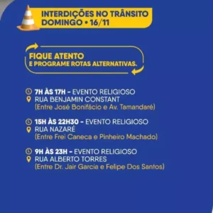 Os moradores de Campo Grande devem se preparar para mudanças significativas no trânsito neste domingo (16). Três vias serão interditadas ao longo do dia para a realização de eventos religiosos em diferentes regiões da cidade. A Agetran (Agência Municipal de Transporte e Trânsito) alerta que os motoristas devem ficar atentos aos horários, redobrar a atenção e planejar rotas alternativas para evitar atrasos.