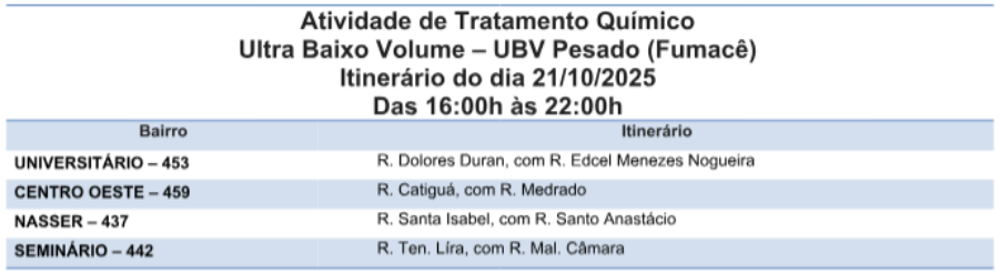As equipes da CCEV (Coordenadoria de Controle de Endemias Vetoriais) da Sesau (Secretaria Municipal de Saúde) circularão das 16h às 22h, passarão pelos bairros: Universitário, Jardim Centro Oeste, Vila Nasser e Jardim Seminário .