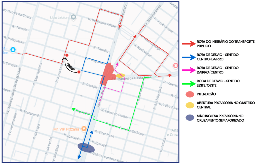 Durante o período, há sinalização provisória e mudança temporária no itinerário dos ônibus. O ponto de parada que funcionava na Rua Clineu da Costa Moraes com a Avenida Cuiabá foi transferido para a Rua Amim Lescani com a Rua Potiguaras, até a conclusão das obras.