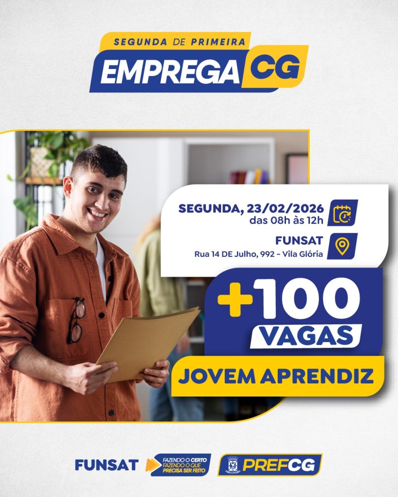 Manhã de recrutamentos, em mais de 100 vagas, direcionadas ao público jovem, é a tônica da Funsat (Fundação Social do Trabalho), para o início desta segunda-feira, 23 de fevereiro. Oferta do novo projeto do Emprega CG, que inicia em 2026 o “Segunda de Primeira”, evento pronto para reunir nesta ação 15 anunciantes com contratações.