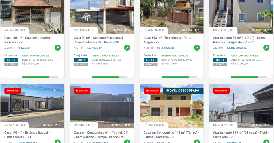 O Banco Santander Brasil realiza um Super Leilão imobiliário online que reúne mais de 1.300 imóveis distribuídos por diferentes regiões do país, oferecendo oportunidades para quem busca adquirir a casa própria ou investir no mercado imobiliário. Os imóveis estão distribuídos entre duas plataformas de leilão: 684 lotes disponíveis no site da Mega Leilões e 690 ofertados pela Pestana Leilões, totalizando mais de 1,3 mil propriedades. A expectativa é que novos lotes ainda possam ser incorporados à carteira da Mega e Pestana até a data do evento, ampliando o número de oportunidades disponíveis.
