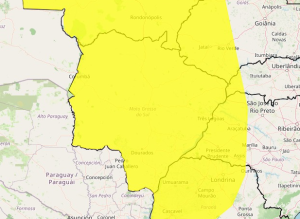 Todo o Mato Grosso do Sul segue sob aviso de perigo potencial para chuvas intensas nesta segunda-feira (13). A condição é válida ao longo do dia, com previsão de volumes entre 20 e 30 milímetros por hora, podendo atingir até 50 milímetros no acumulado, além de rajadas de vento entre 40 e 60 km/h.