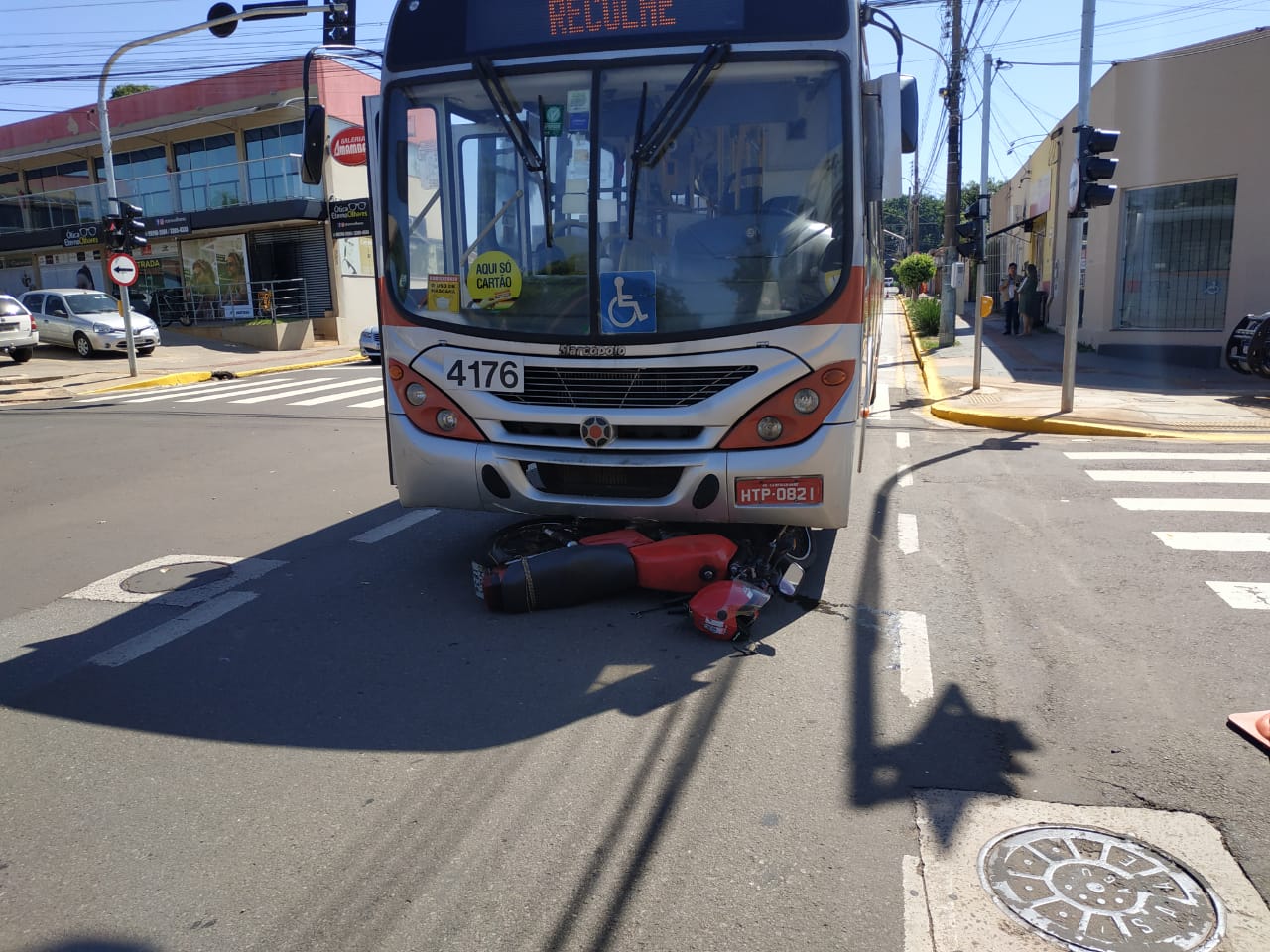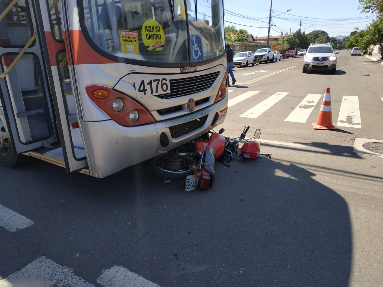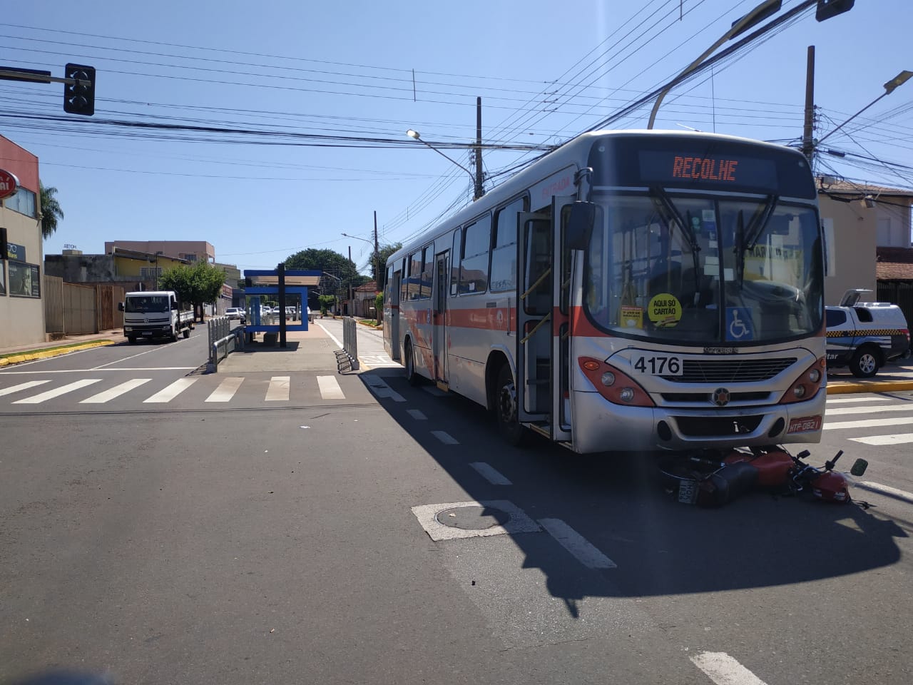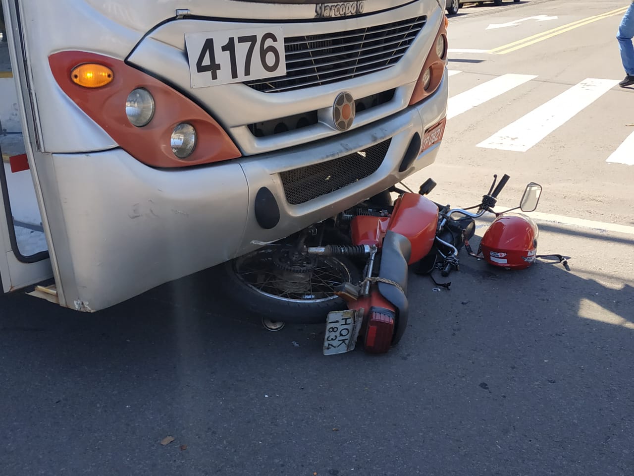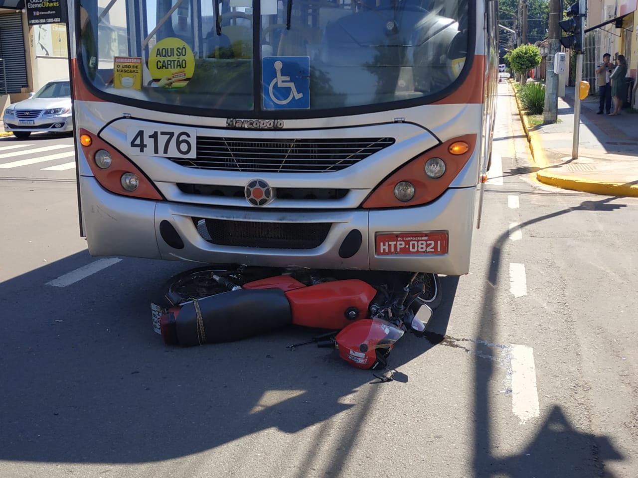 Um acidente no recém inaugurado corredor de ônibus foi registrado na manhã de hoje (20) no cruzamento das ruas Guia Lopes e Paissandú. A colisão entre uma motocicleta e um ônibus do transporte coletivo deixou o veículo preso na parte inferior do ônibus.