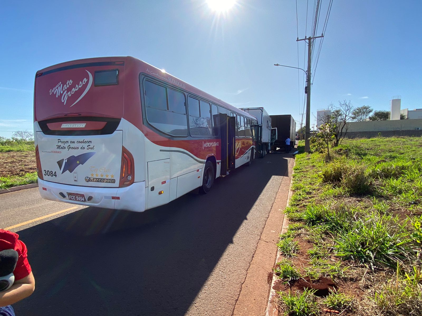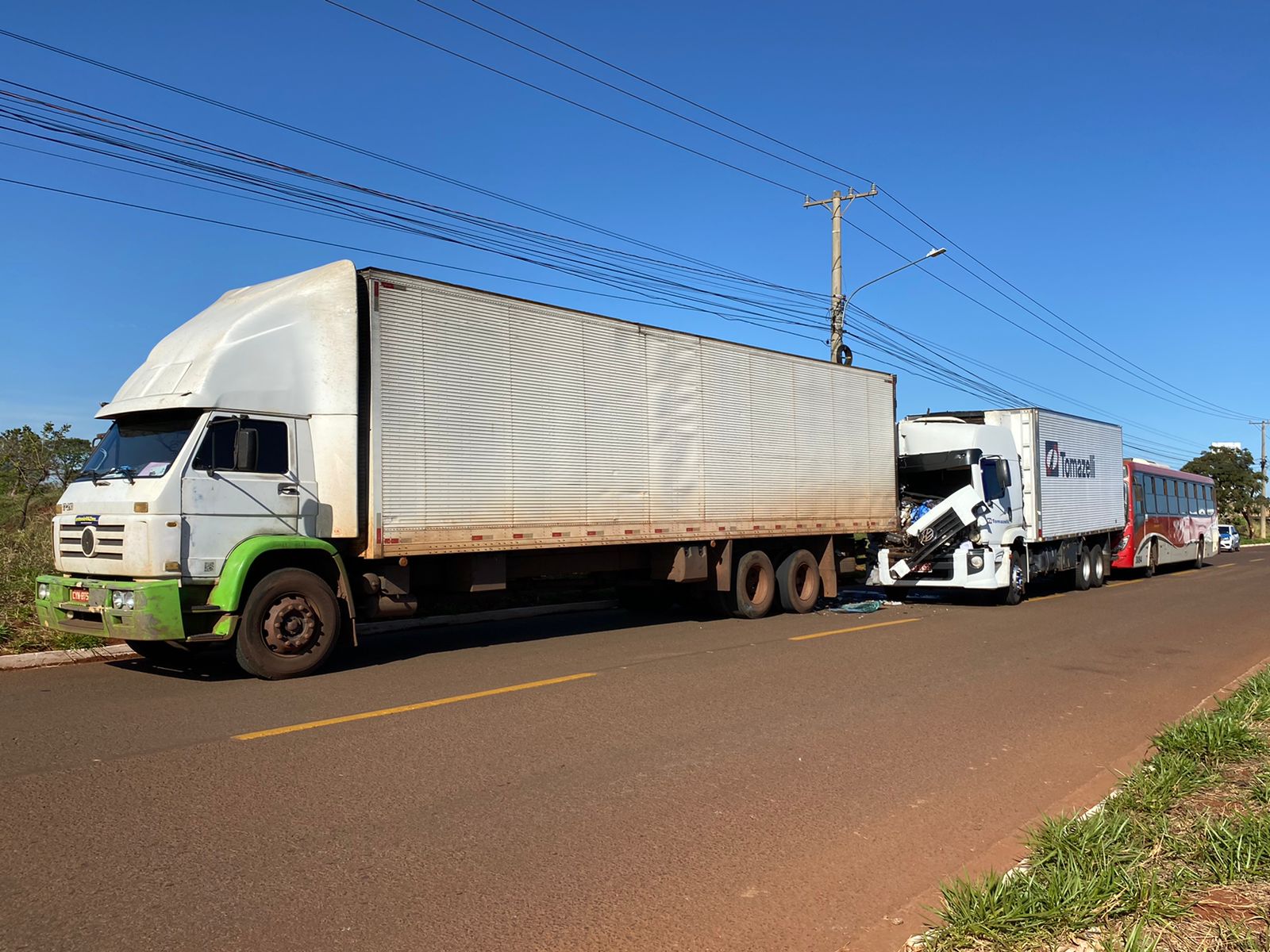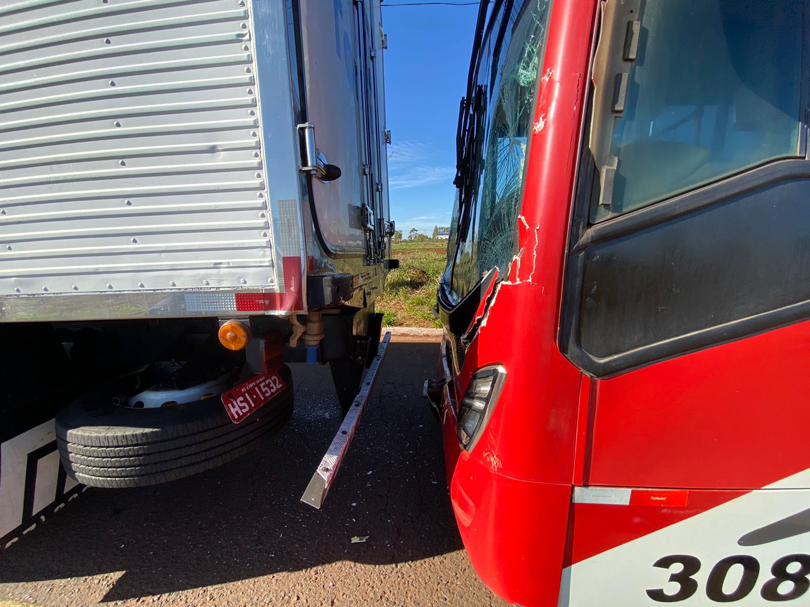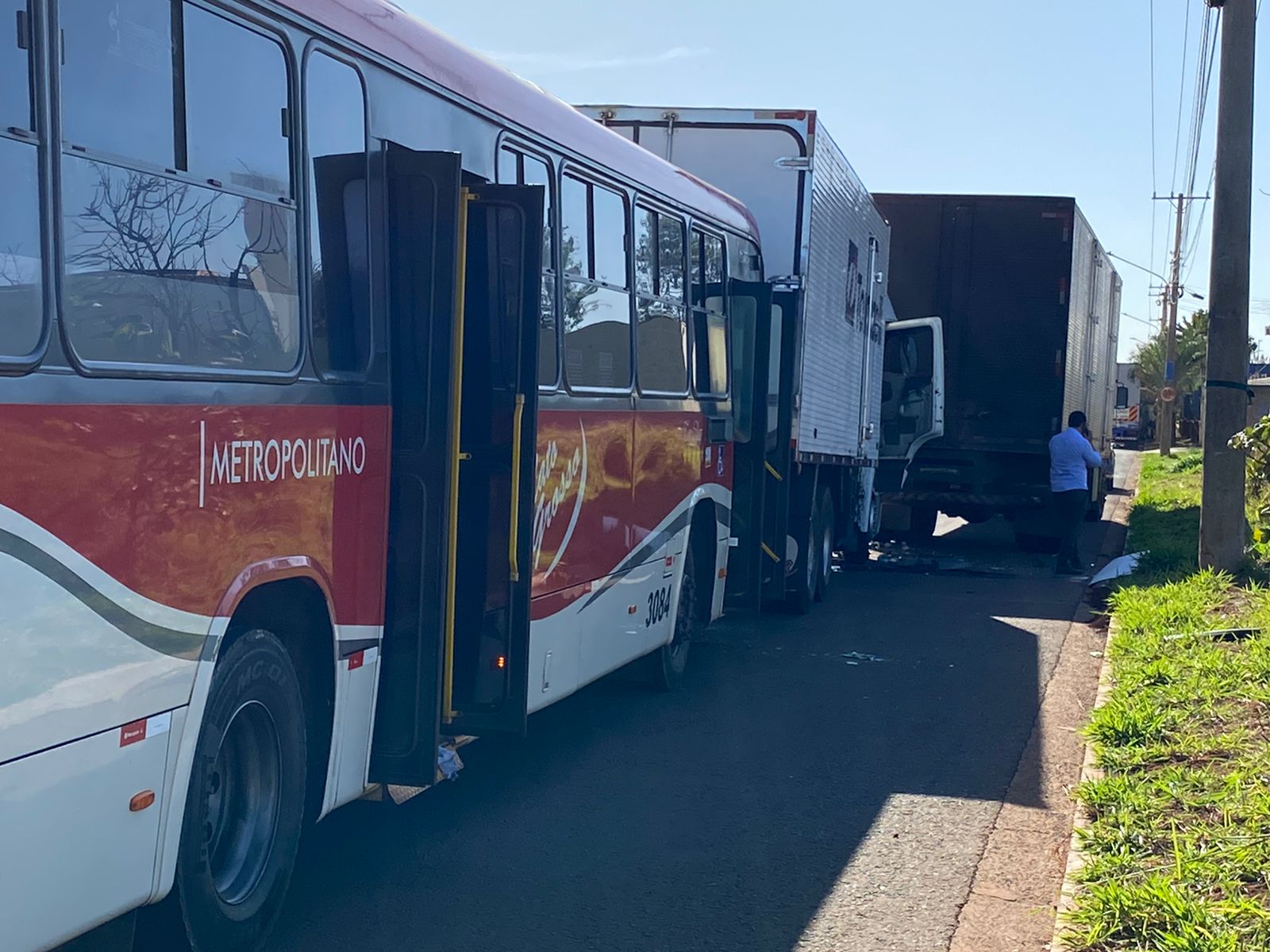 Como uma reação em cadeia, o ônibus colidiu na traseira do segundo caminhão e também teve a frente danificada, perdendo o para-brisa no processo do acidente. Ele fazia o trajeto de Terenos a Campo Grande com funcionários de fábricas próximas. Condutores e passageiros passam bem.
