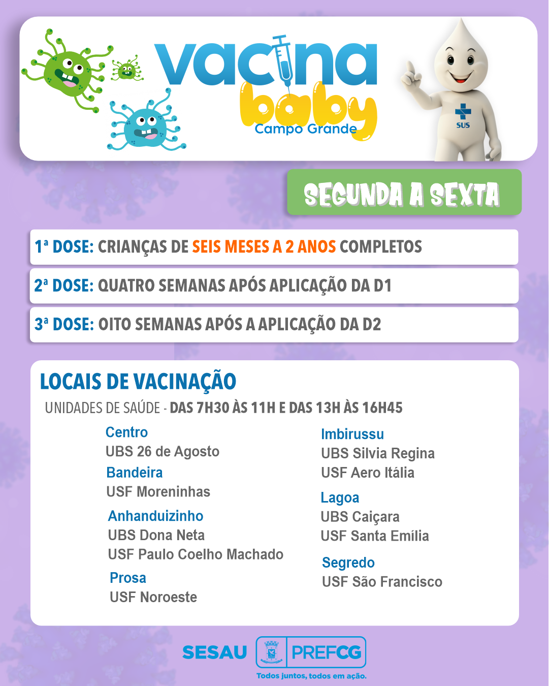 A vacina disponibilizada pelo Sistema Único de Saúde (SUS) em todas as unidades de saúde da Capital protege contra os vírus H1N1 e H3N2 da Influenza A e contra a Influenza B, sendo eficaz contra as três formas diferentes de gripe.