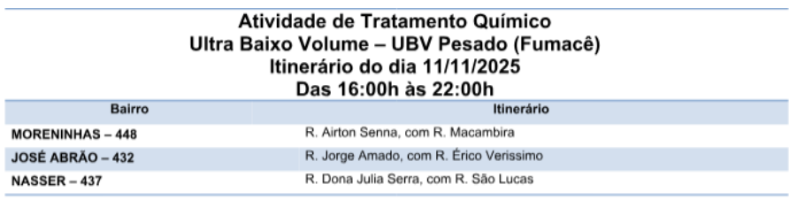 As equipes da CCEV (Coordenadoria de Controle de Endemias Vetoriais) da Sesau (Secretaria Municipal de Saúde) circularão das 16h às 22h pelas ruas dos seguintes bairros: Moreninhas, José Abrão e Vila Nasser.