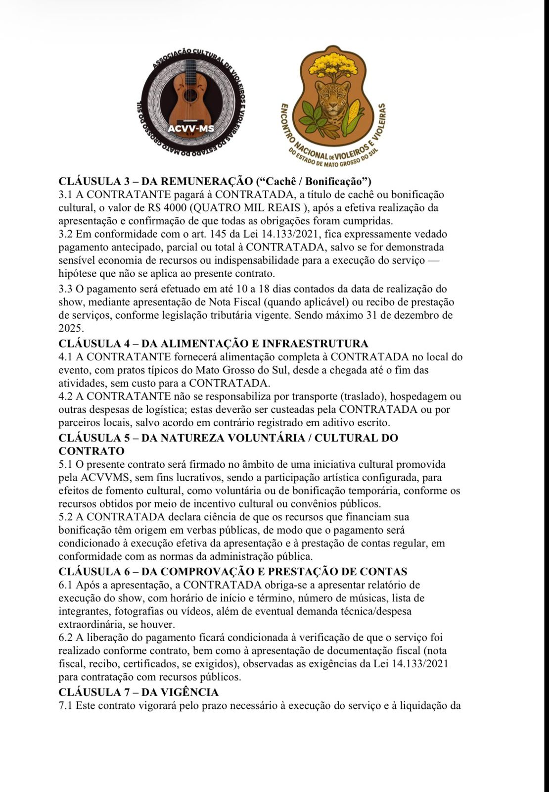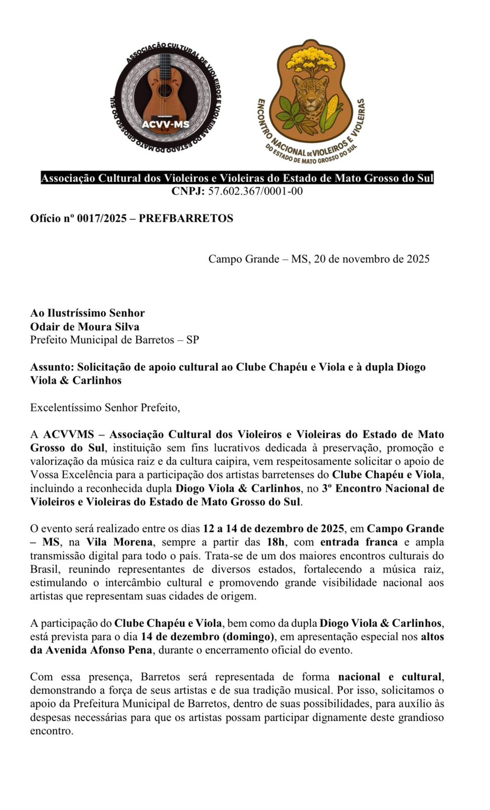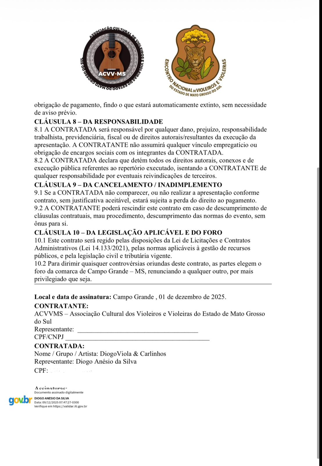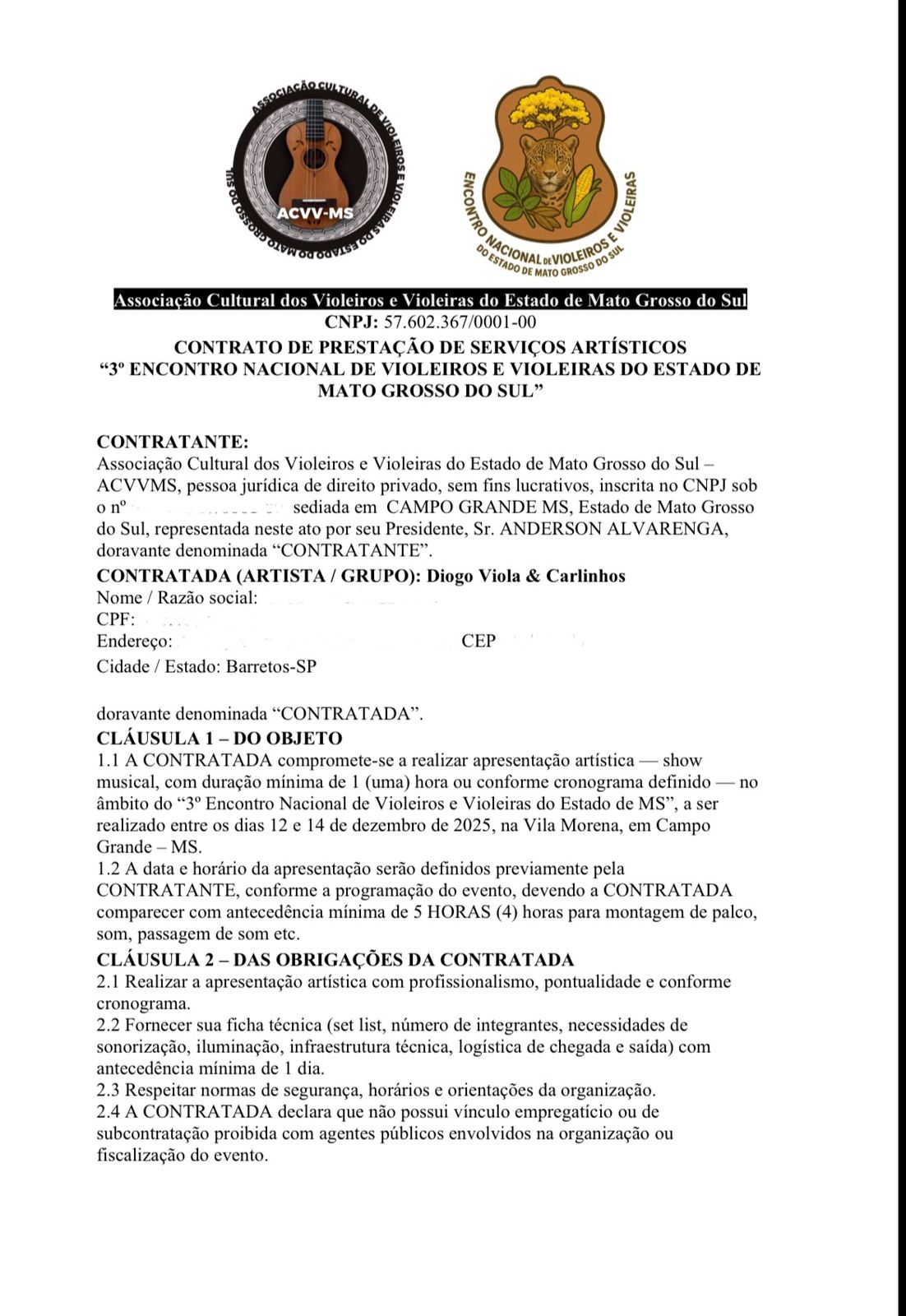 O músico Diogo Silva, representante da dupla Diogo Viola e Carlinhos, de Barretos (SP) procurou o Jornal O Estado Online para denunciar a falta de pagamento de cachês a artistas que participaram do Encontro de Violeiros de Campo Grande 2025, realizado em dezembro. Segundo ele, os músicos foram contratados pela ACVV-MS (Associação Cultural de Violeiros e Violeiras do Estado de Mato Grosso do Sul), presidida por Anderson Alvarenga, mas não receberam os valores acordados em contrato.