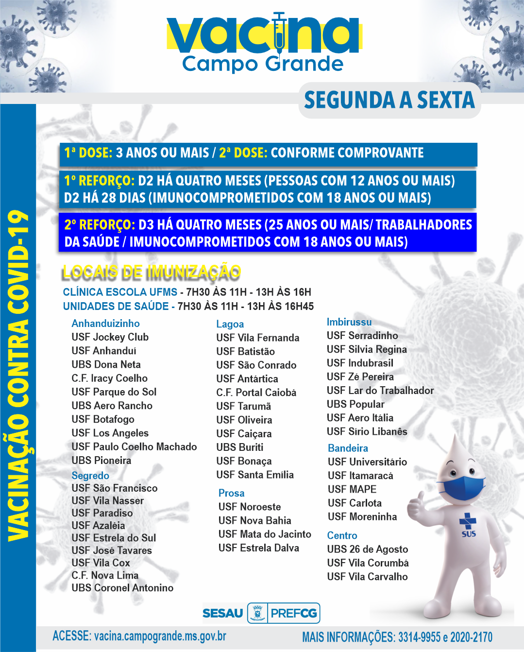 Para quem quer iniciar 2023 protegido e com esquema vacinal completo, a vacinação contra Covid-19 segue disponível de primeira a quarta dose, em mais de 50 unidades de saúde de Campo Grande.