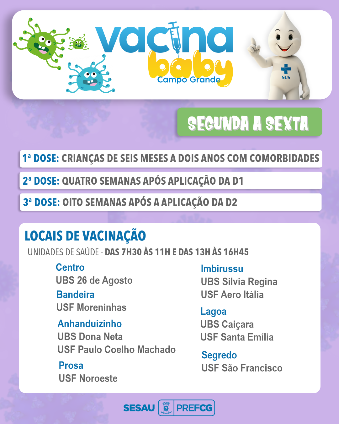 A primeira dose da vacina está disponível para toda a população, incluindo crianças de seis meses a dois anos sem comorbidades. Para crianças entre seis meses a dois anos o imunizante aplicado é Pfizer Baby.