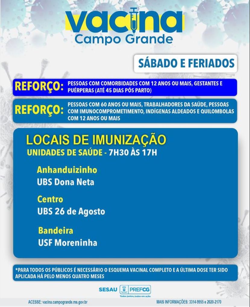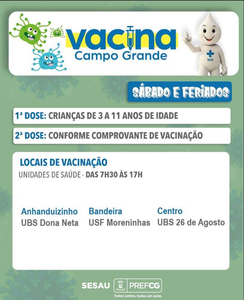 Se você deixou para completar o esquema vacinal no fim de semana, Campo Grande promove mais um plantão de vacinação contra Covid-19 e gripe neste sábado (15), a vacinação ocorre em cinco unidades de saúde da Capital.