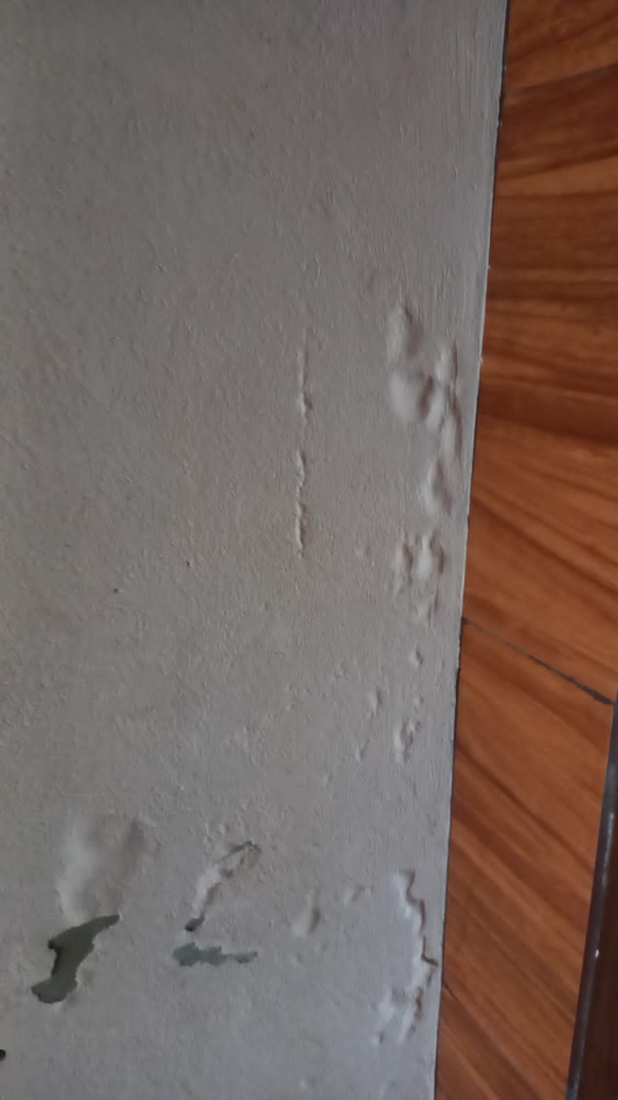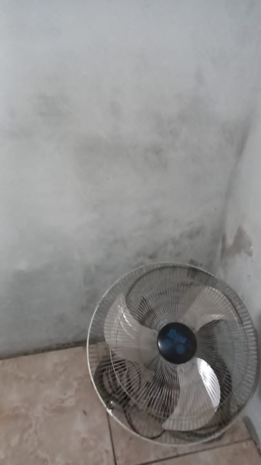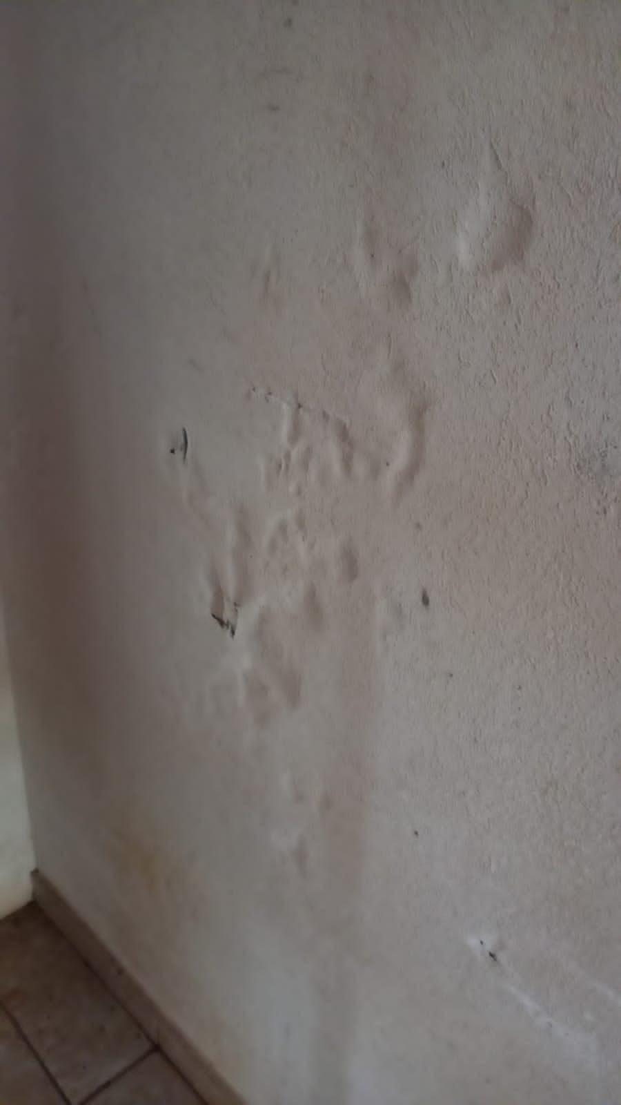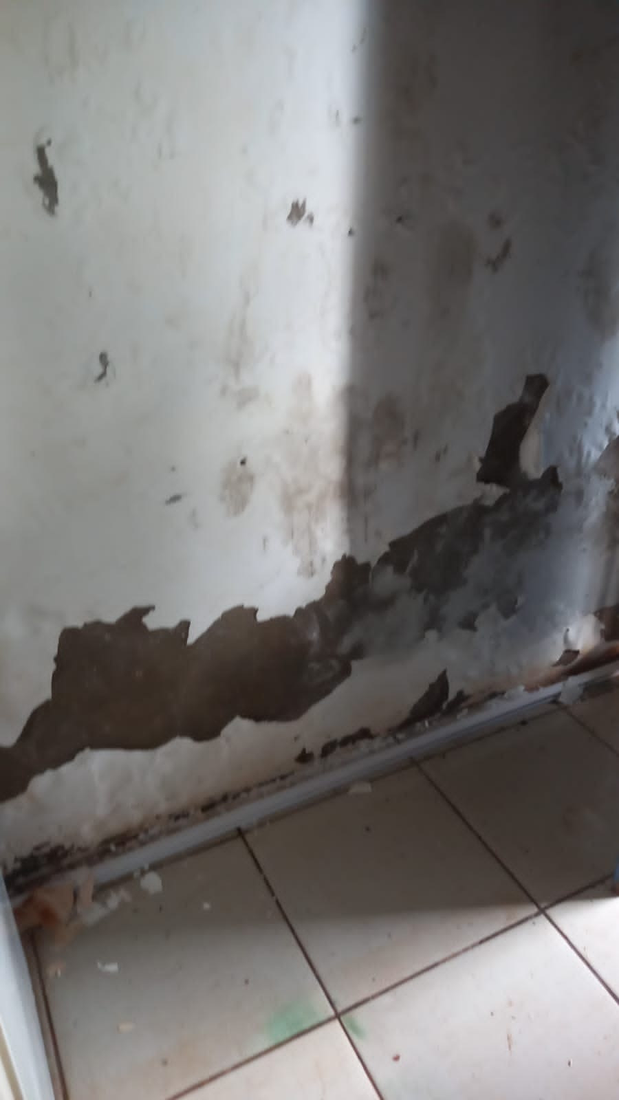 Nas fotos é possível ver os estragos que umidade da água da chuva, mal escoada, deixou nas paredes da casa. Manchas, pintura descascada, mofo, ferrugem, queda de reboco. O morador teme que caso o problema não se resolva, haja um comprometimento das estruturas da construção.