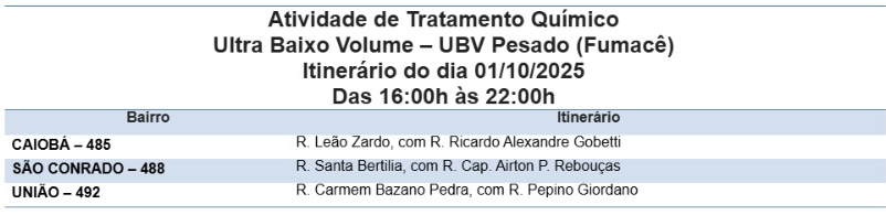 As equipes da CCEV (Coordenadoria de Controle de Endemias Vetoriais) da Sesau (Secretaria Municipal de Saúde) circularão das 16h às 22h pelas ruas dos seguintes bairros: Caiobá, São Conrado e União.