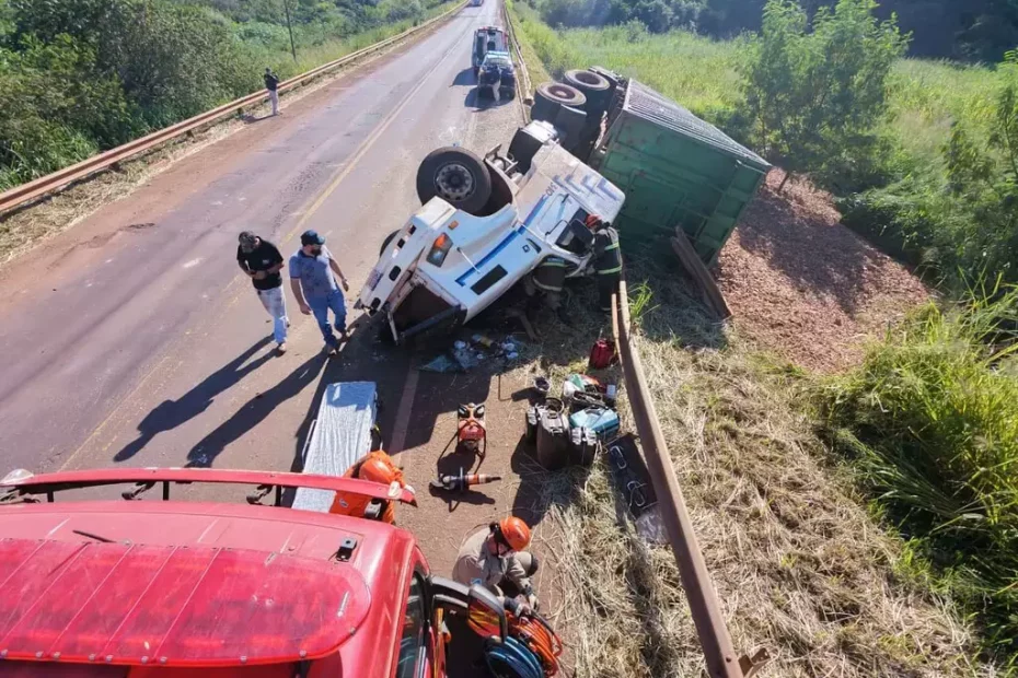 Motorista sai ileso após tombamento de carreta na BR-463, entre Dourados e Ponta Porã