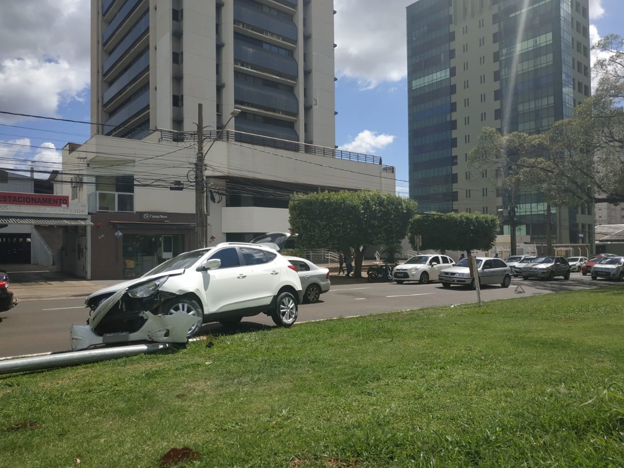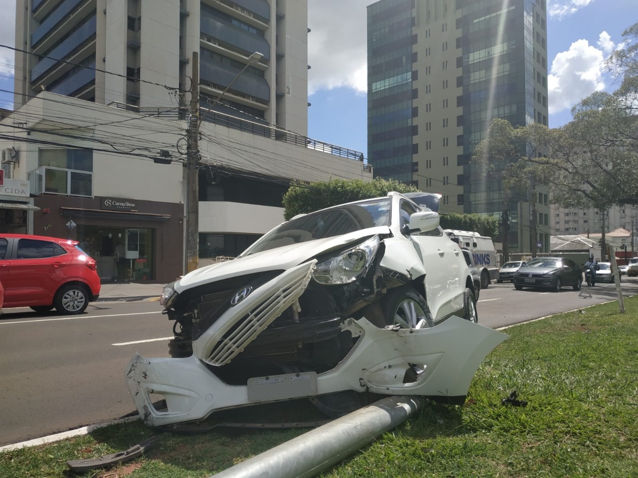 A condutora do terceiro veículo envolvido, um carro de luxo da marca Hyundai, não conseguiu frear e jogou o carro para o canteiro, batendo em um poste que caiu no chão.