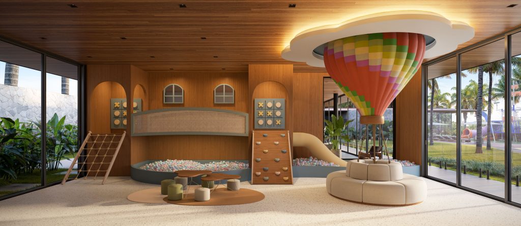 Com forte apelo de lazer e convivência, o empreendimento contará com piscina praia de 2.000 m², lago contemplativo, brinquedoteca lúdica, capela exclusiva, complexo esportivo com quadras cobertas e descobertas, academia completa com aparelhos da marca Technogym, spa e uma passarela panorâmica elevada sobre a água. Os ambientes terão mobiliário assinado e materiais naturais, reforçando a proposta sensorial.
