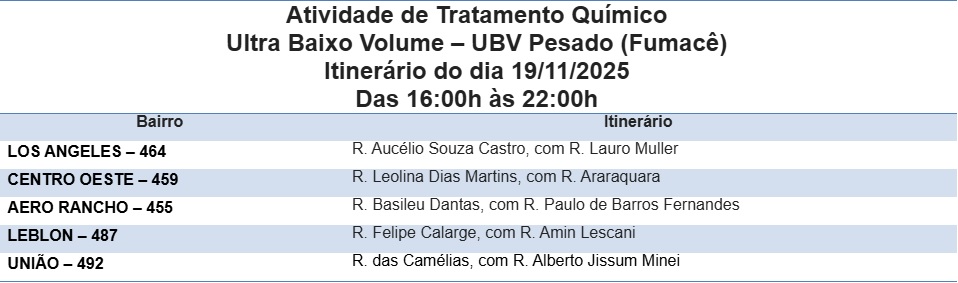 As equipes circularão das 16h às 22h pelos bairros Los Angeles, Centro Oeste, Aero Rancho, Leblon e União, seguindo roteiro definido pela Gerência de Controle de Endemias Vetoriais.