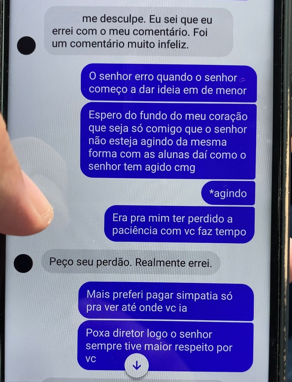 Segundo a mãe, a descoberta das mensagens ocorreu depois que a alertaram sobre a divulgação de prints nas redes sociais. Ela conta que ao ler as mensagens ficou chocada com a situação e resolveu denunciar o diretor.