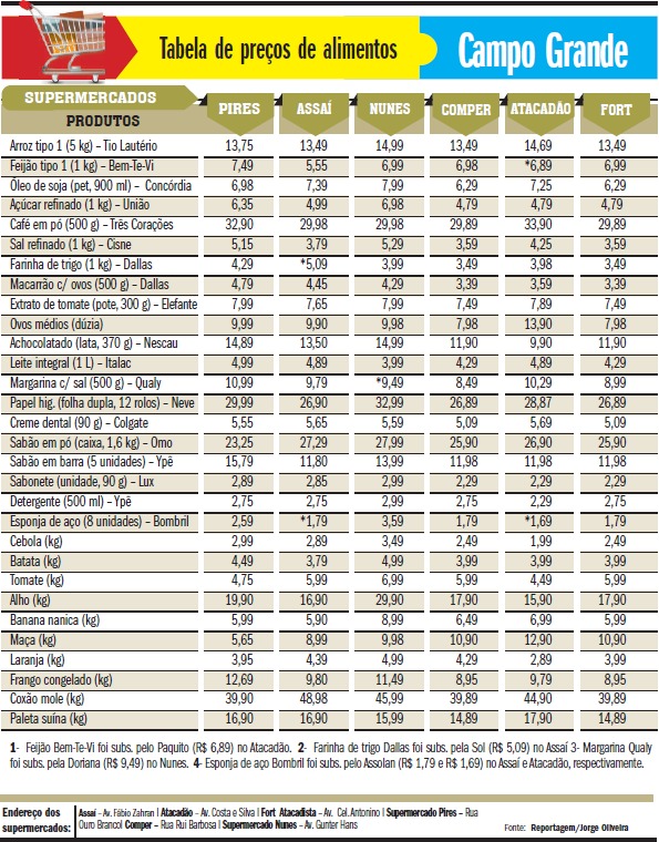 O coxão mole apresentou variação de 23%, oscilando de R$ 39,89 a R$ 48,98, média de R$ 43,26. O sabão em pó (1,6 kg) teve diferença de 20%, com valores entre R$ 23,25 e R$ 27,99, média de R$ 26,20.