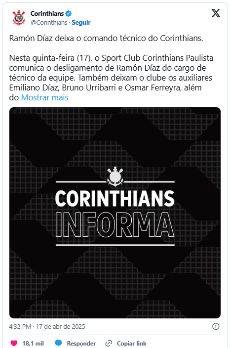 Em nota divulgada nas redes sociais e no site oficial, o clube do Parque São Jorge comunicou também o desligamento dos auxiliares Emiliano Díaz, Bruno Urribarri e Osmar Ferreyra, além do preparador físico Diego Pereira. “Nesta quinta-feira [17], o Sport Club Corinthians Paulista comunica o desligamento de Ramón Díaz do cargo de técnico da equipe”, informou o clube.