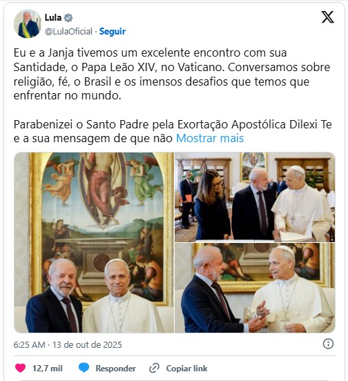Em publicação nas redes sociais, Lula afirmou que a conversa abordou religião, fé, o Brasil e os desafios mundiais. O presidente destacou ter falado ao pontífice sobre a necessidade de “criar um amplo movimento de indignação contra a desigualdade”, tema que o governo brasileiro vem defendendo em fóruns internacionais.