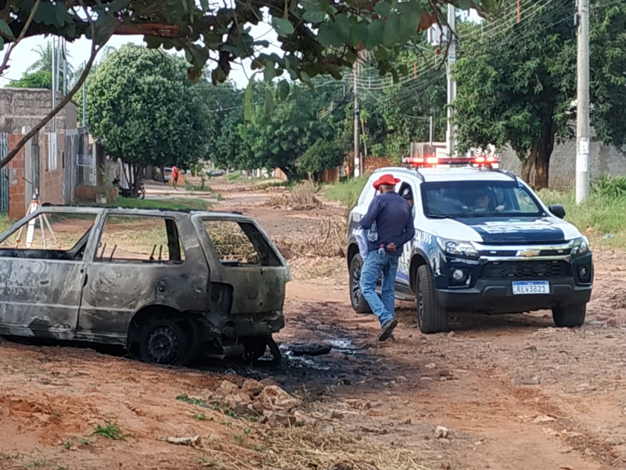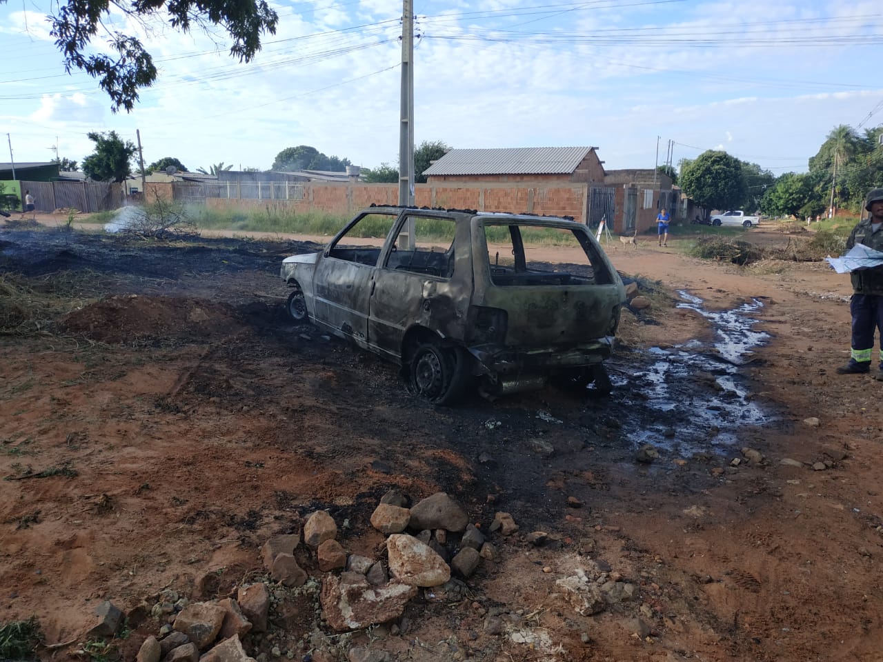 O proprietário do automóvel realizava um serviço de topografia no bairro, quando foi informado que alguém havia colocado fogo no terreno em que o carro estava estacionado, atingindo o veículo.