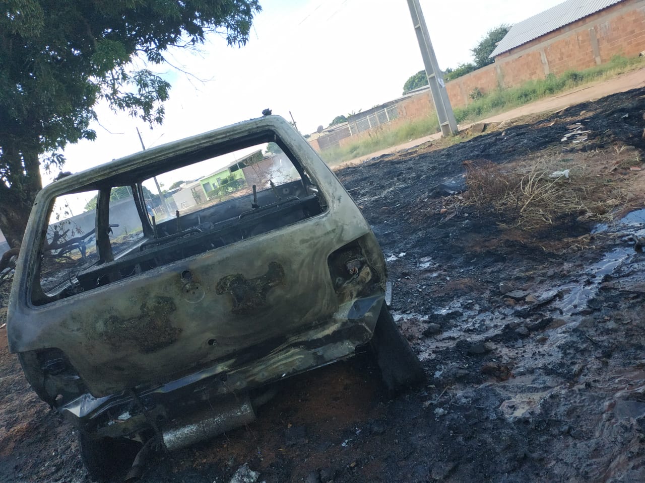 Um veículo, de modelo Fiat Uno, da cor azul, ficou totalmente destruído após pegar fogo na tarde de hoje (2), no bairro Nova Lima.