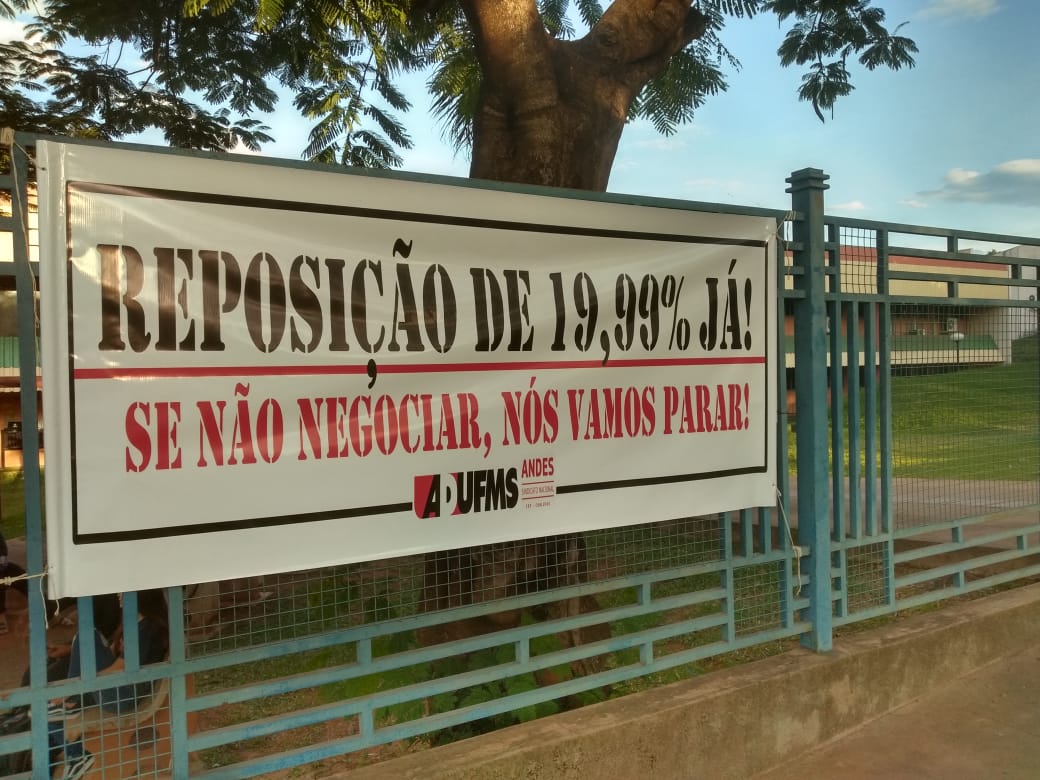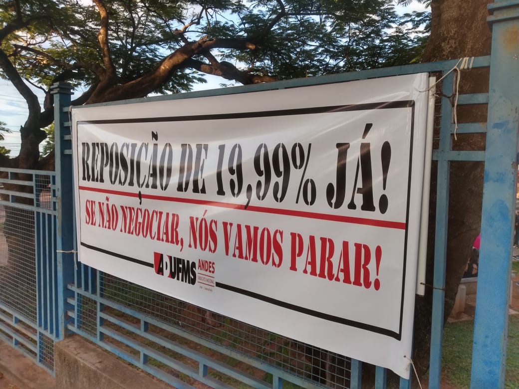 Os campus da UFMS (Universidade Federal de Mato Grosso do Sul), em Campo Grande e Corumbá, amanheceram com faixas fixadas em alusão ao indicativo de greve, anunciado na última quarta-feira (23). Os professores reivindicam o reajuste salarial que não ocorre desde 2017.