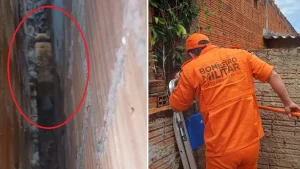 Preso em fresta de muro, gato mobiliza resgate dos bombeiros em Nova Andradina