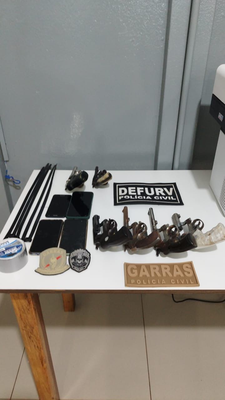 Dentro do veículo Fiat/Uno, foram encontrados objetos como braçadeiras e fita silver tape, além das armas de fogo, indicando claramente a intenção criminosa da quadrilha. A ação policial impediu que o roubo com restrição de liberdade das vítimas ocorresse, preservando não apenas o patrimônio, mas também a integridade física e mental das potenciais vítimas.
