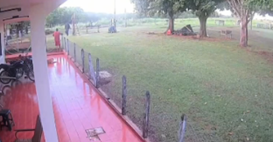 Imagens da câmera de segurança mostra o momento do crime, quando a vítima aparece de camiseta vermelha dentro da propriedade rural. Ele está na varanda da casa e conversa com o autor que está do lado de fora da cerca. Em certo momento, o atirador entra e vai até o rapaz, ele tira a arma da cintura e atira. Em seguida, foge para a área de mata.