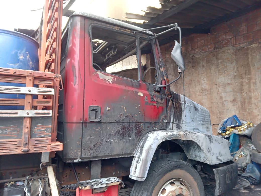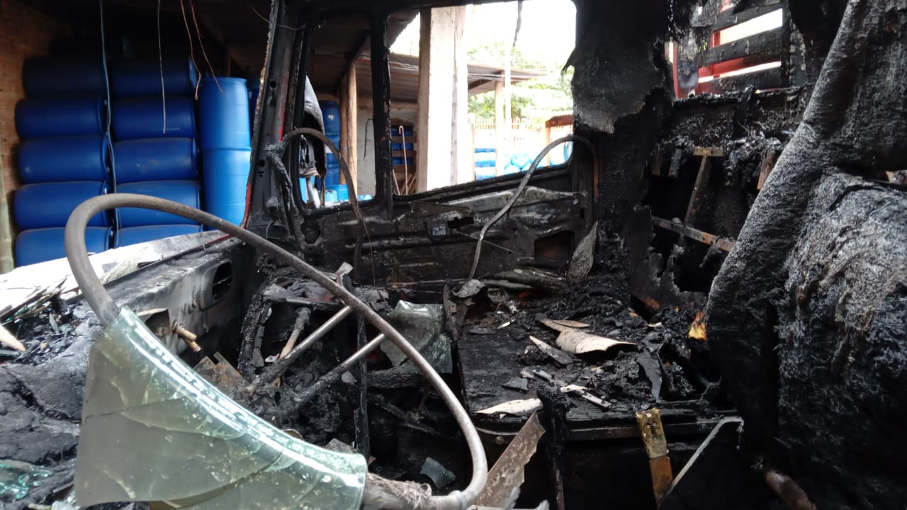 O caminhão pegou fogo na cabine, em alguns galões e em algumas partes do local. O corpo de bombeiros foi acionado e conteve o fogo rapidamente, evitando um prejuízo maior.