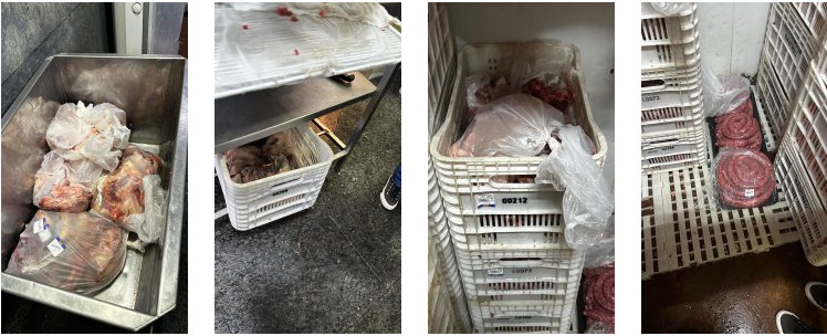 Durante a fiscalização, os agentes encontraram carnes bovina, suína e de frango armazenadas em condições inadequadas, colocando em risco a saúde dos consumidores. Parte dos produtos estava acondicionada em câmaras frias junto a itens de padaria, como pães, além de caixas de papelão, prática proibida pelas normas sanitárias por caracterizar contaminação cruzada.