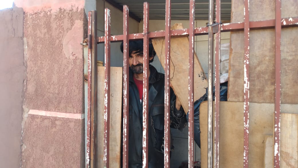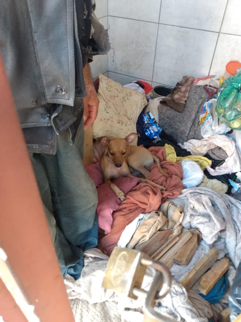 O homem que teve a identificação, entrou dentro desse depósito junto com o cachorro e desde então está morando no local, ele aparentemente é mudo, ele se alimenta somente com as comidas que as pessoas que moram na proximidade dão para ele.
