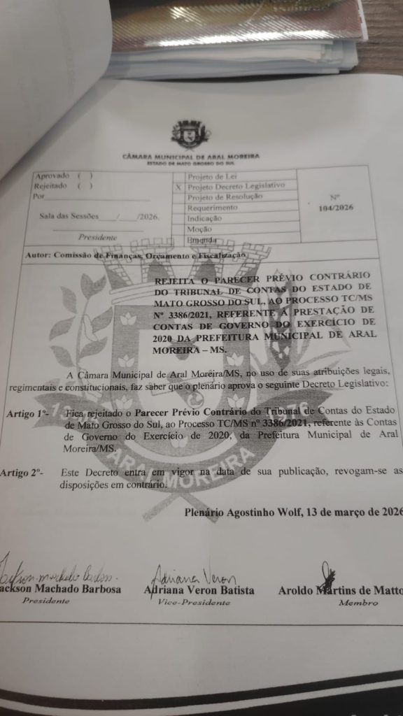 A Câmara Municipal de Aral Moreira realizou, na manhã desta segunda-feira (16), a votação das contas da Prefeitura referentes ao exercício de 2020 em uma sessão extraordinária convocada durante a própria sessão ordinária realizada no mesmo dia. Segundo relatos de pessoas presentes no plenário, durante o andamento da sessão ordinária os vereadores foram informados de que, logo após o encerramento da reunião, seria realizada uma sessão extraordinária para deliberar sobre o parecer prévio referente ao Processo TC/MS nº 3386/2021, analisado pelo Tribunal de Contas do Estado de Mato Grosso do Sul.