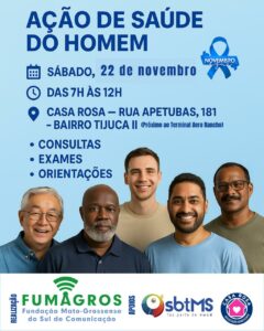 A Casa Rosa promove neste sábado (22), uma grande Ação de Saúde do Homem, em alusão ao Novembro Azul, oferecendo uma manhã de cuidados, prevenção e orientação gratuita à população. O evento acontece das 7h às 12h, na sede da instituição, localizada na Rua Apetubas, 181 — Bairro Tijuca II, próximo ao Terminal Aero Rancho.