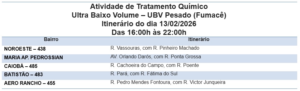 O combate ao mosquito Aedes aegypti, transmissor de doenças como dengue, zika e chikungunya, será reforçado em cinco bairros de Campo Grande nesta sexta-feira (13) com a aplicação do inseticida por meio do serviço de ultrabaixo volume (UBV), conhecido como fumacê.