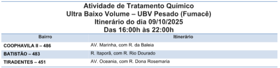 De acordo com a coordenação, as atividades podem ser adiadas ou suspensas caso ocorram chuvas, ventos fortes ou neblina, já que essas condições reduzem a eficácia da aplicação.