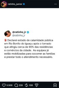 O governador do estado, Ratinho Junior (PSD) decretou estado de calamidade pública, na cidade de Rio Bonito d Iguaçu, após o tornado ter atingido 90% dos imóveis do município.